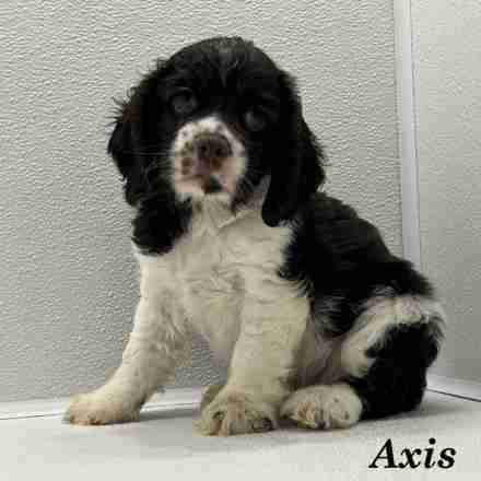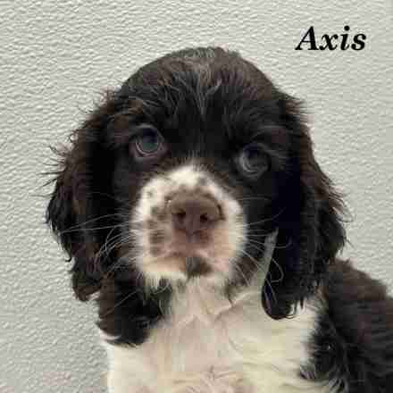 Axis is a Chocolate & White Parti American Cocker boy. Axis has a tendency to want to be lazy. He would rather sit on the porch with you and watch everyone else.