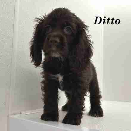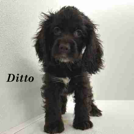 Ditto is a Chocolate w/ White American Cocker girl. Ditto is a little bit shy at times. Not to people just loud new noises. But she is coming around, and starting to be the first one who wants to be loved.