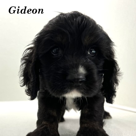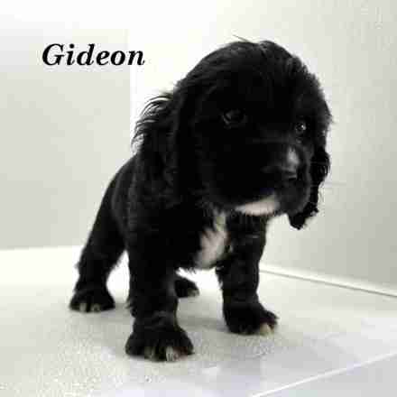 Gideon is a beautiful Black & Fawn Sable w/ White American Cocker boy. Gideon is a curious little one. If you are up doing something he must know right away what that is.