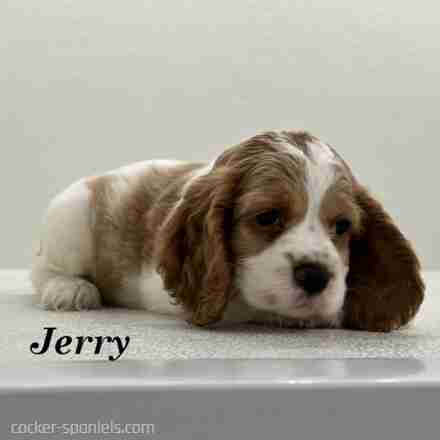 Jerry is a Red & White Parti American Cocker boy. Jerry is a playful guy, he loves to chase everything around the yard. He will always make you smile.