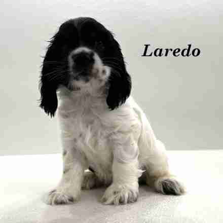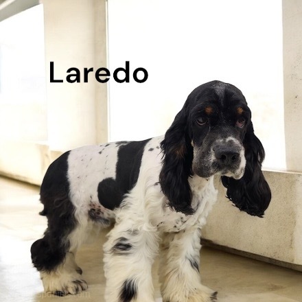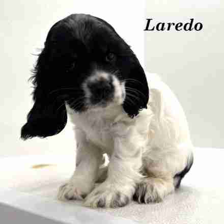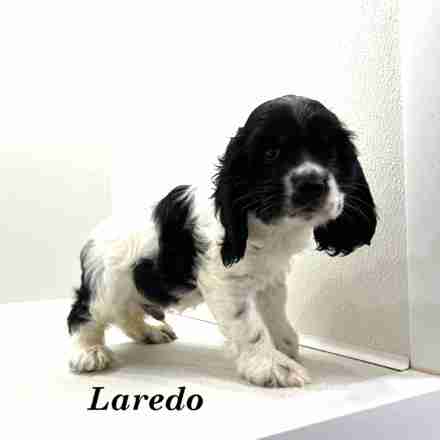 Laredo is a Black & White Parti w/ Tan Tips American Cocker boy. Laredo is a sweetheart of a boy. Those Tan Tips you can just barely see, they are at his eyebrows and along his cheek.