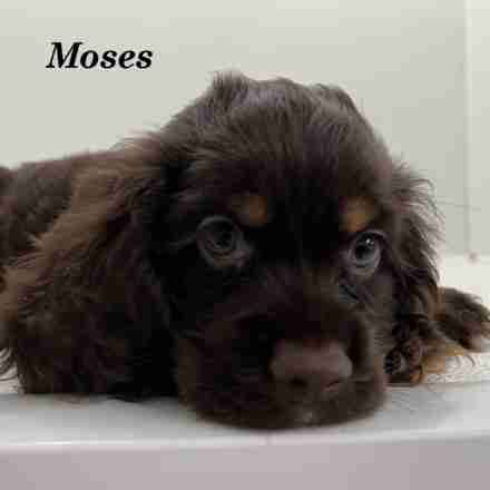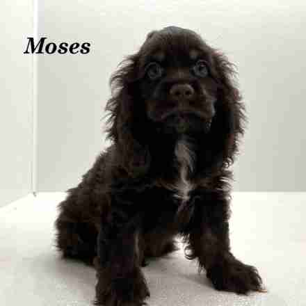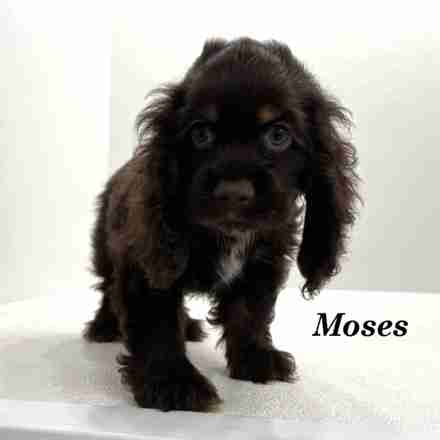 Moses is a Chocolate & Tan w/ White American Cocker boy. Moses is a sweet boy. He loves to cuddle and give kisses.