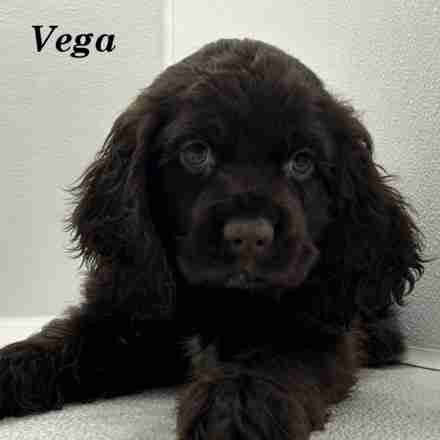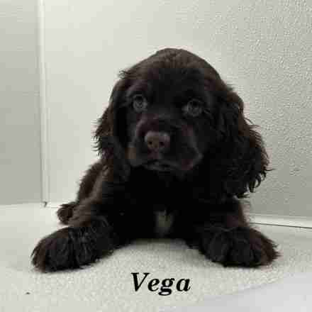 Vega is a Chocolate w/ White American Cocker girl. Vega is a sweet little girl. She loves to cuddle with you and take naps.